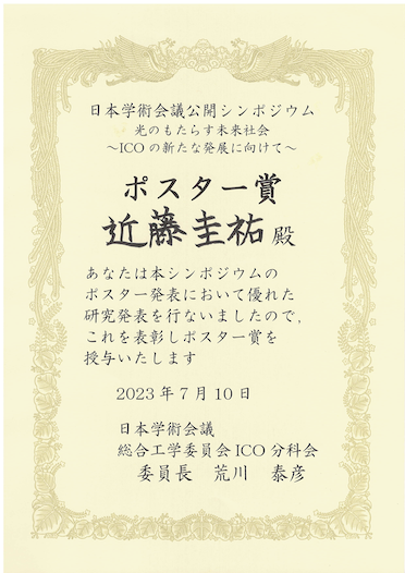 近藤圭祐助教が,2023年7月10日に開催された日本学術会議公開シンポジウム 光のもたらす未来社会 ~ICOの新たな発展に向けて~においてポスター賞を受賞しました.おめでとうございます!